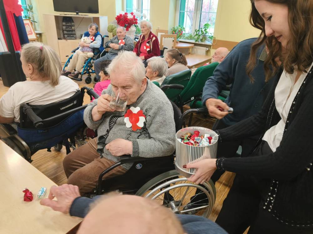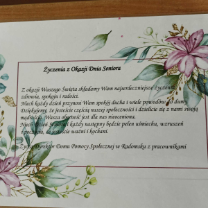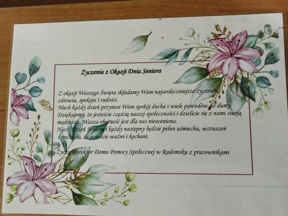 Tegoroczne obchody Dnia Seniora nasi mieszkańcy rozpoczęli 13 listopada przyjmując życzenia przekazane przez młodzież i opiekunów ze Szkolnego Klubu Wolontariusza w imieniu społeczności Zespołu Szkół Drzewnych i Ochrony Środowiska w Radomsku.